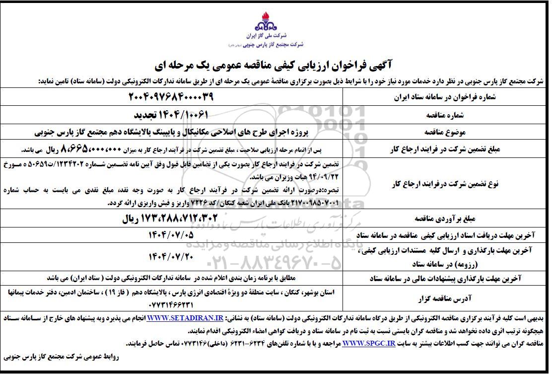 موضوع مناقصه : پروژه اجرای طرح های اصلاحی مکانیکال و پایپینگ پالایشگاه دهم مجتمع گاز پارس جنوبی