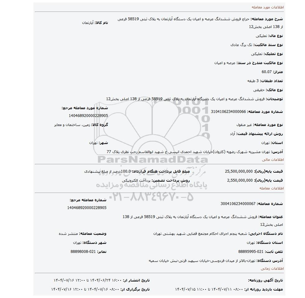 عنوان معامله: فروش ششدانگ عرصه و اعیان یک دستگاه آپارتمان به پلاک ثبتی 58519 فرعی از 138 اصلی بخش12