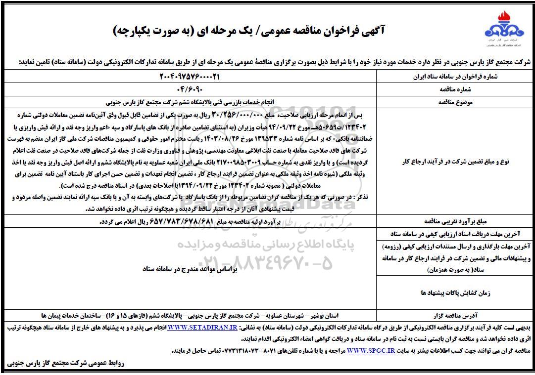 شرکت مجتمع گاز پارس جنوبی در نظر دارد خدمات مورد نیاز خود را با شرایط ذیل بصورت برگزاری مناقصه عمومی یک مرحله ای از طریق سامانه تدارکات الکترونیکی دولت سامانه ستاد تامین نماید