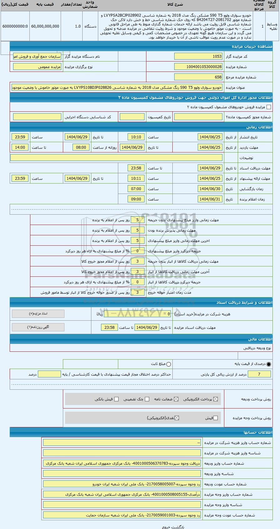 | وسایط نقلیه | 1 | خودرو سواری ولوو S90 T5 مشکی رنگ مدل 2018 به شماره شاسی LVYPSA2BCJP028902 و شماره موتور B4204T27-2081702 که روی حک شماره شاسی خط و خش دارد لاکن حک شماره شاسی قابل روئیت می باشد ارائه خدمات شماره گذاری منوط به طی مراحل قانونی است. - به صورت موتور خاموش با وضعیت موجود و شرط روئیت نتقاضی در مزایده عدضه و تحویل می گردد و این سازمان هیچ گونه تعهدی در خصوص مشخصات کمی و کیفی وسایل نقلیه تحویلی ندارد و در صورت عدم رویت عواقب ناشی از آن با خریدار خواهد بود. | دستگاه | 1.0 | 60,000,000,000 | 6000000000:0 |