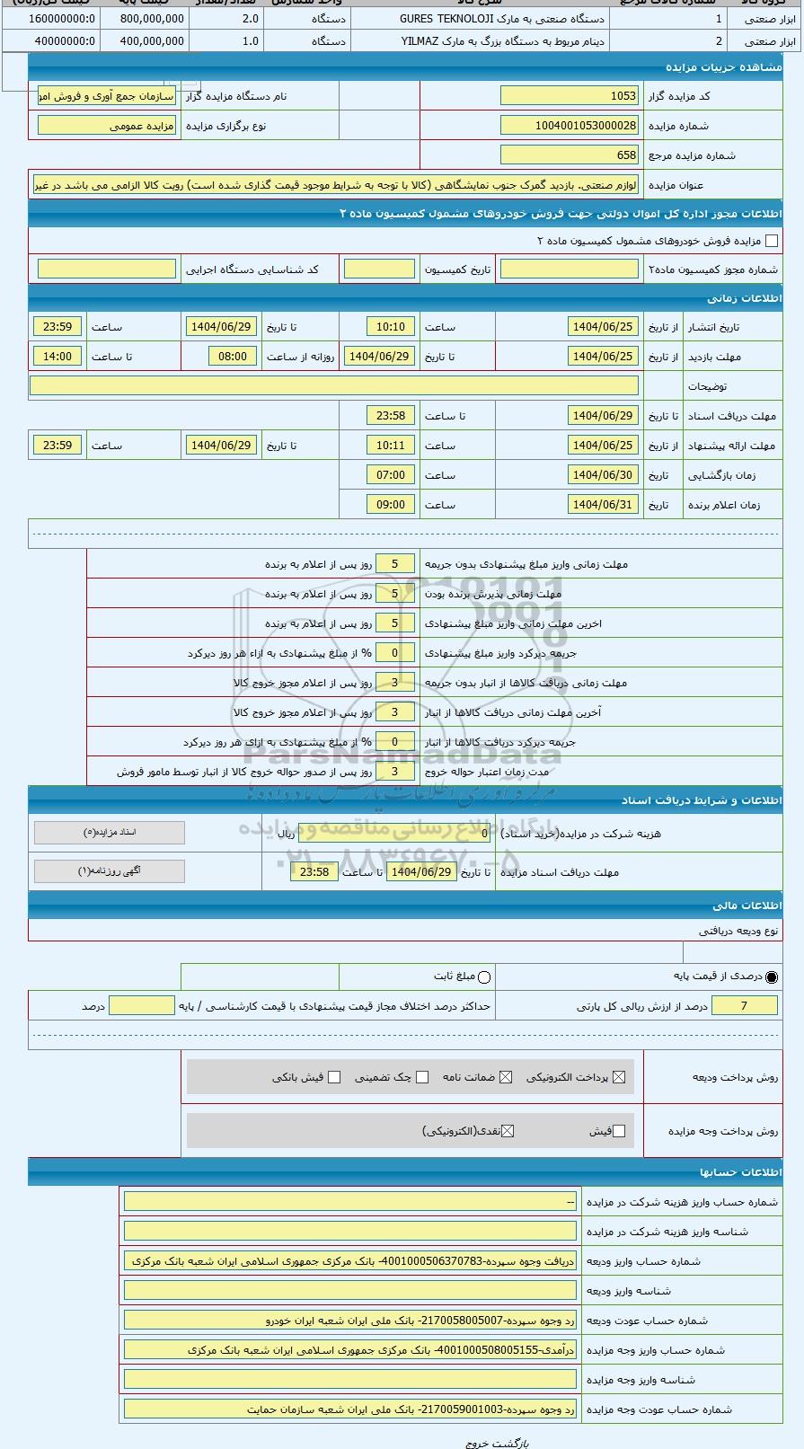 | کد مزایده گزار | 1053 | نام دستگاه مزایده گزار | سازمان جمع آوری و فروش اموال تملیکی | |