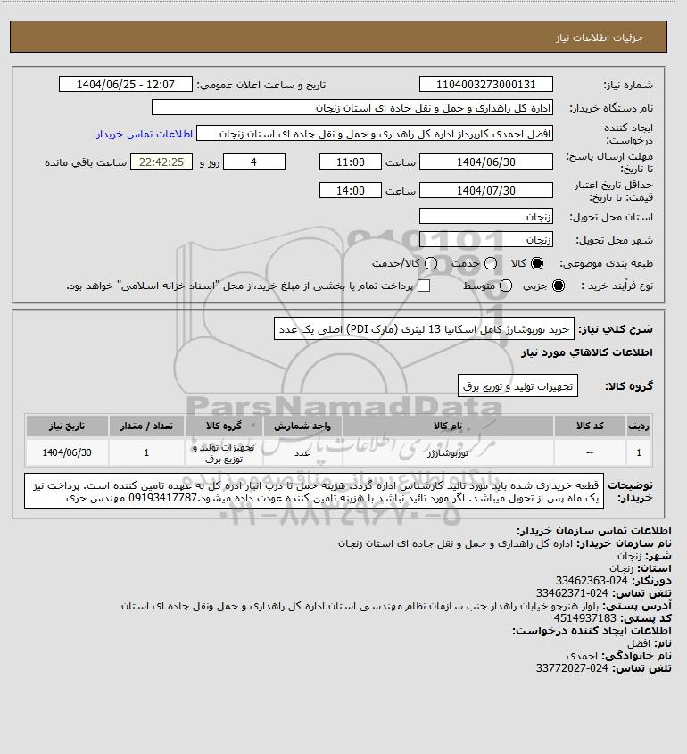 شرح کلی نیاز: خرید توربوشارژ کامل اسکانیا 13 لیتری (مارک PDI) اصلی یک عدد