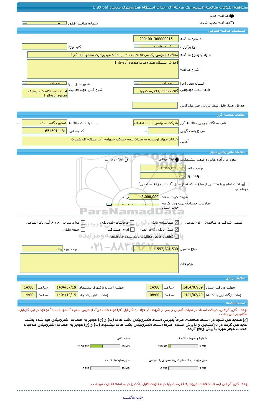 | نام دستگاه اجرایی مناقصه گزار | شرکت سهامی اب منطقه ای همدان | مسئول ثبت مناقصه | همایون گلمحمدی |