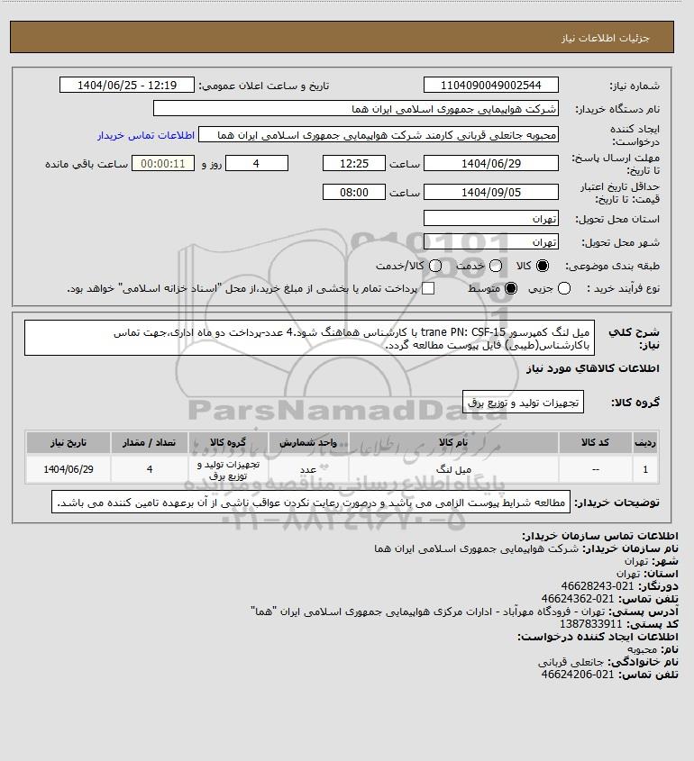 استعلام بها و موضوع استعلام استعلام میل لنگ کمپرسور trane PN: CSF-15 با کارشناس هماهنگ شود.4 عدد-پرداخت دو ماه اداری،جهت تماس باکارشناس(طیبی) فایل پیوست مطالعه گردد. به اطلاع کلیه شرکتها و افراد متخصص واجد شرایط میرساند، آگهی گذار در نظر دارد از طریق استعلام بها، نسبت به انتخاب و دریافت پیشنهادات اقدام نماید. این استعلام با کد آگهی ثبت شده در سامانه خبرگزاری پارس نماد : 9556401 منتشر شده است. مشخصات استعلام : تاریخ شروع استعلام: 1404/06/25 آخرین مهلت ارسال پیشنهاد قیمت : 1404/06/29 و محل اجرای پروژه : استان تهران میباشد. استعلام قیمت مورد درخواست : استعلام میل لنگ کمپرسور trane PN: CSF-15 با کارشناس هماهنگ شود.4 عدد-پرداخت دو ماه اداری،جهت تماس باکارشناس(طیبی) فایل پیوست مطالعه گردد. با دستهبندیهای تخصصی و گروه های مرتبط : کمپرسورهای هوا, کلیه خدمات و تامین تجهیزات صنایع هوایی, تجهیزات و ماشین آلات صنعتی, استعلام اطلاع رسانی میگردد.