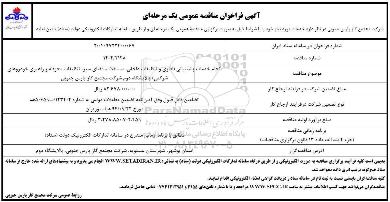 شرکت مجتمع گاز پارس جنوبی در نظر دارد خدمات مورد نیاز خود را با شرایط ذیل بصورت برگزاری مناقصه عمومی یک مرحله ای و از طریق سامانه تدارکات الکترونیکی دولت سامانه (ستاد) تامین نماید.