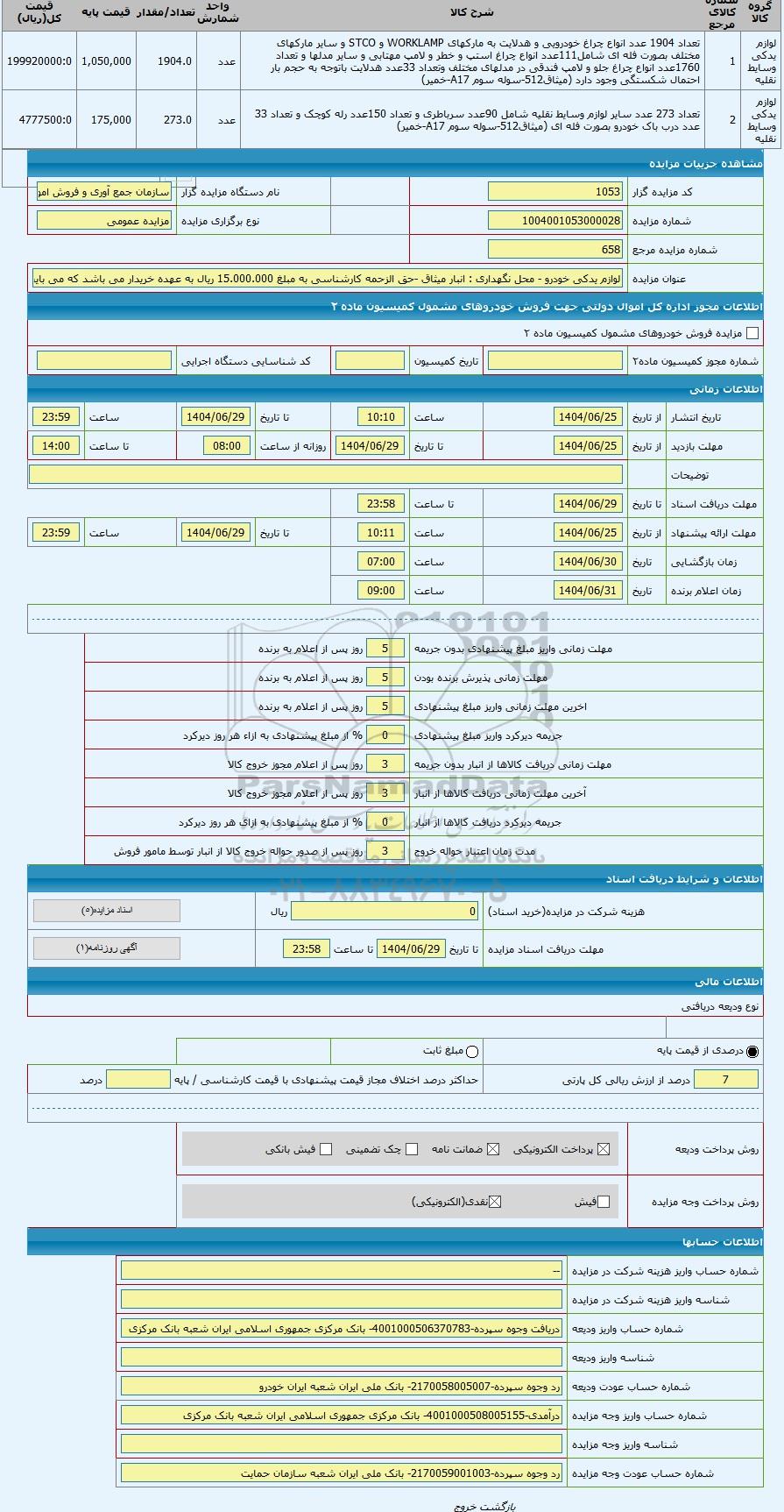 | عنوان مزایده | لوازم یدکی خودرو - محل نگهداری : انبار میثاق -حق الزحمه کارشناسی به مبلغ 15.000.000 ریال به عهده خریدار می باشد که می بایست به حساب کانون کارشناسان واریز گردد. | |||