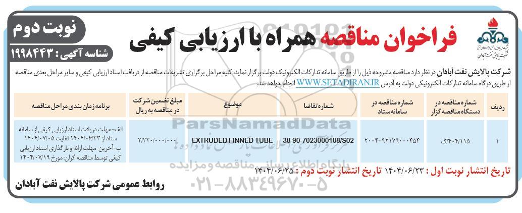 | 1 | 404/115/ ک | 2004092179000454 | 38-90-7223000108/S02 | EXTRUDED FINNED TUBE | 2.220.000.000 |