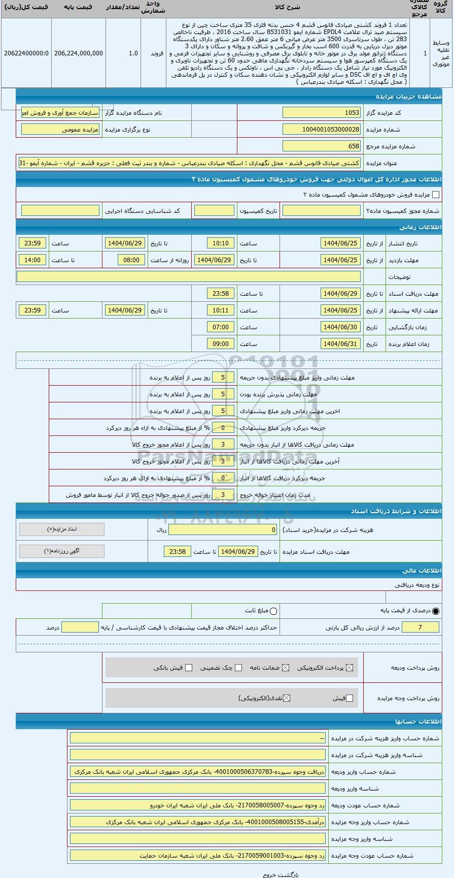 | عنوان مزایده | کشتی صیادی فانوس قشم - محل نگهداری : اسکله صیادی بندرعباس - شماره و بندر ثیت فعلی : جزیره قشم - ایران - شماره آیمو -8531031( در صورت اخذ مجوز های لازم و تعمیر تجهیزات مربوطه و تایید مراتب توسط اداره ثبت شناوران قابل بهره برداری می باشد .ضمنا کلیه هزینه ها و بدهی های مالیاتی ، تامین اجتماعی و هر گونه بدهی دیگر به عهده خریدار می باشد. حق الزحمه کارشناسی به مبلغ 604.714.000 به عهده خریدار می باشد که می بایست به حساب کانون کارشناسان واریز گردد. به همراه هزینه پارکینگ تا خروج شناور بعهده خریدار می باشد.-شرایط پرداخت ( ضمانت نامه بانکی 3 ماهه و اخذ پیش پرداخت نقدی به میزان 10% مبلغ پیشنهادی و پرداخت 10% مالیات بر ارزش افزوده بصورت نقدی امکان پذیر می باشد ) | |||