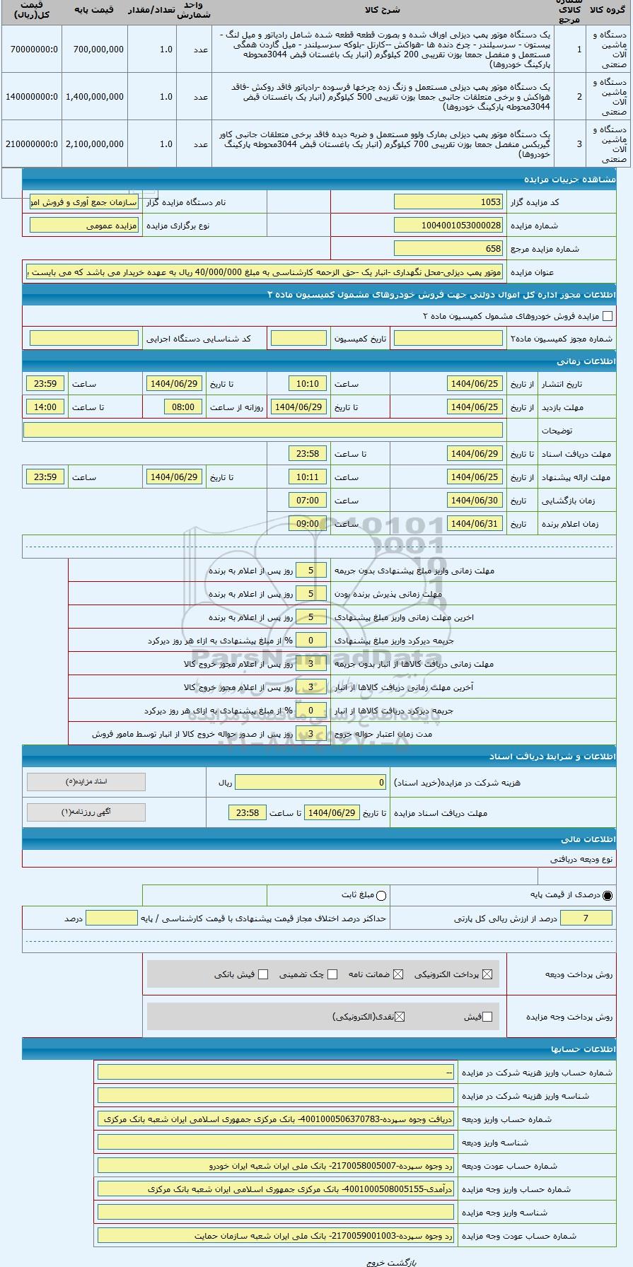 مزایده موتور پمپ دیزلی-محل نگهداری -انبار یک -حق الزحمه کارشناسی به مبلغ 40/000/000 ریال به عهده خریدار می باشد که می بایست به, مزایده ، موتور پمپ دیزلی-محل نگهداری -انبار یک -حق الزحمه کارشناسی به مبلغ 40/000/000 ریال به عهده خریدار می باشد که می بایست به