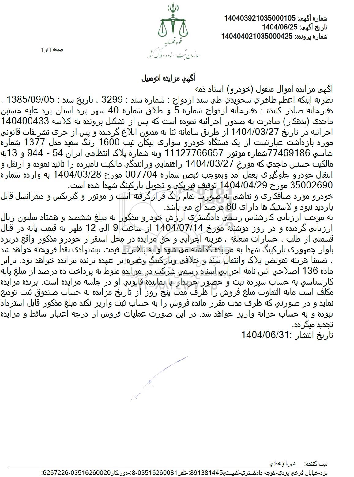 مزایده عمومی مزایده فروش خودرو پیکان تیپ 1600 برگزار میگردد. از کلیه افراد متخصص و شرکتهای واجد شرایط دعوت به عمل میآید تا در این مزایده با کد خبرگزاری پارس نماد : 9556735 شرکت نمایند تاریخ شروع مزایده : 1404/06/25 مهلت شرکت در مزایده: تا پایان روز 1404/07/14 مکان برگزاری اموال واگذاری استانهای یزد و دستهبندیهای مربوط به این حراجی انواع خودرو سبک میباشد.