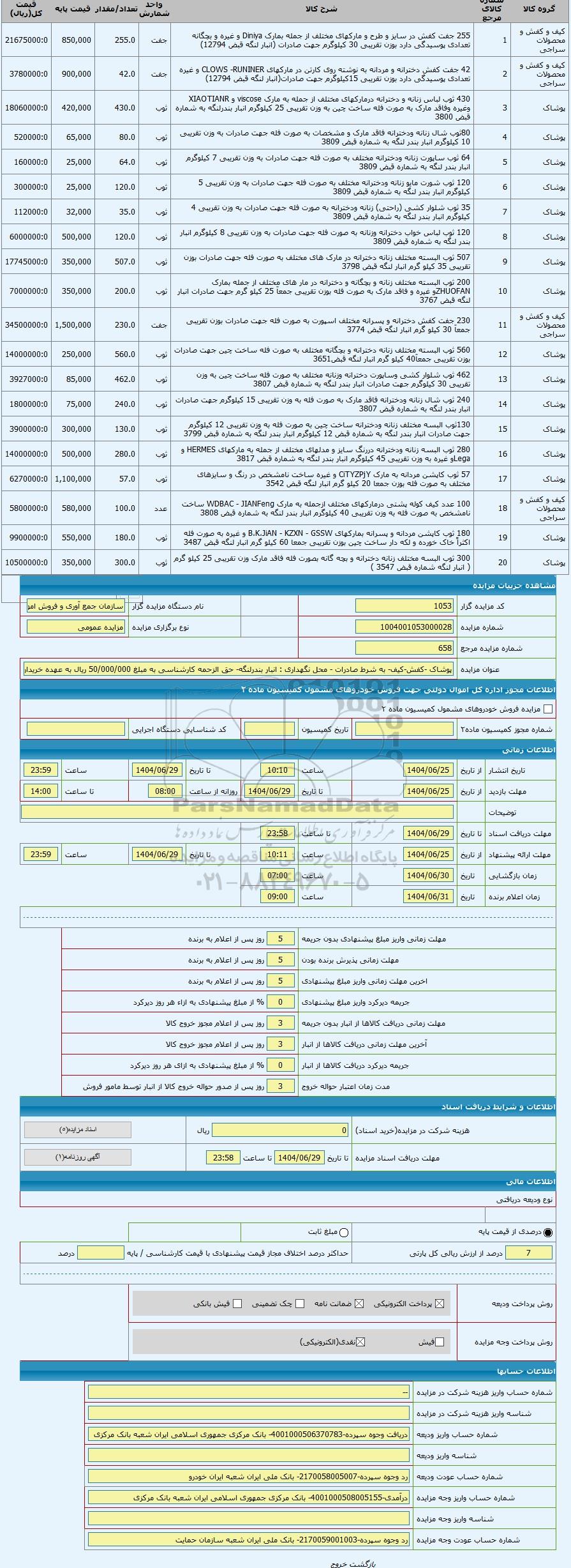 | کد مزایده گزار | 1053 | نام دستگاه مزایده گزار | سازمان جمع آوری و فروش اموال تملیکی | |