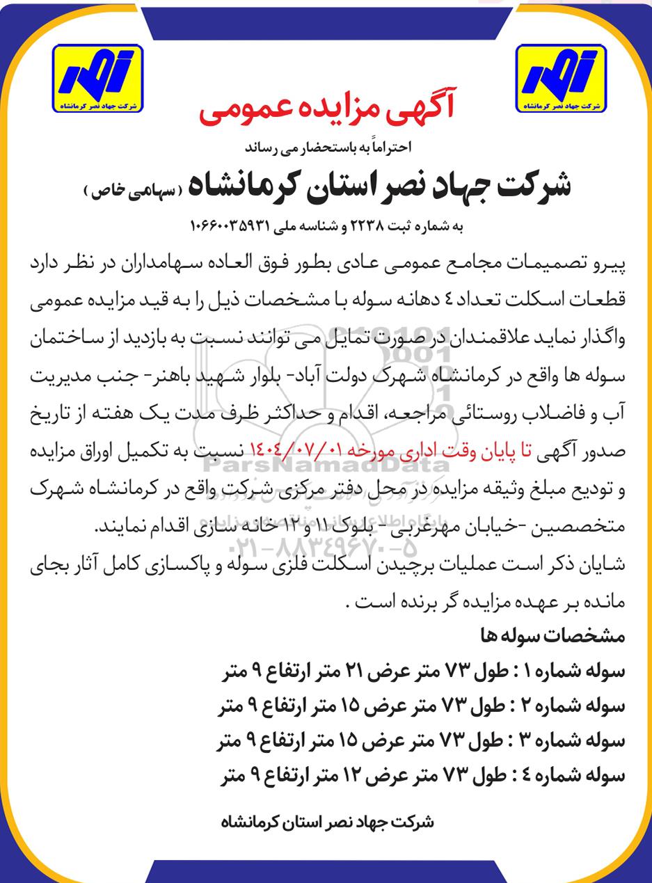 پیرو تصمیمات مجامع عمومی عادی بطور فوق العاده سهامداران در نظر دارد قطعات اسکلت تعداد 4 دهانه سوله با مشخصات ذیل را به قید مزایده عمومی واگذار نماید علاقمندان در صورت تمایل میتوانند نسبت به بازدید از ساختمان سوله ها واقع در کرمانشاه شهرک دولت آباد بلوار شهید باهنر - جنب مدیریت آب و فاضلاب روستائی ،مراجعه اقدام و حداکثر ظرف مدت یک هفته از تاریخ صدور آگهی تا پایان وقت اداری مورخه 1404.7.1 نسبت به تکمیل اوراق مزایده و تودیع مبلغ وثیقه مزایده در محل دفتر مرکزی شرکت واقع در کرمانشاه شهرک متخصصین خیابان مهر غربی - بلوک 11 و 12 خانه سازی اقدام نمایند.