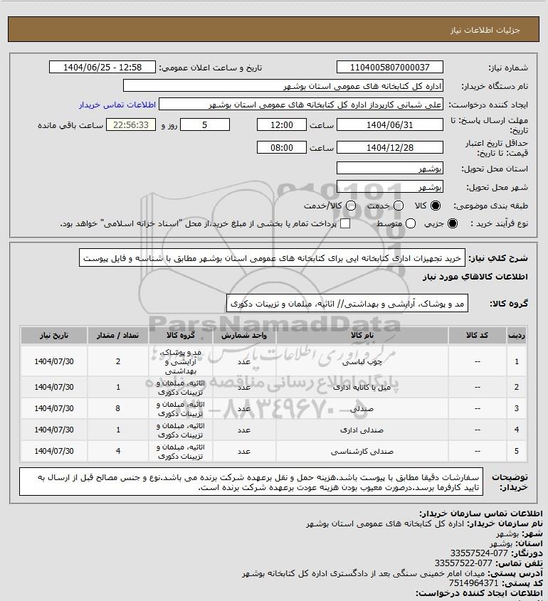 شرح کلی نیاز: خرید تجهیزات اداری کتابخانه ایی برای کتابخانه های عمومی استان بوشهر مطابق با شناسه و فایل پیوست