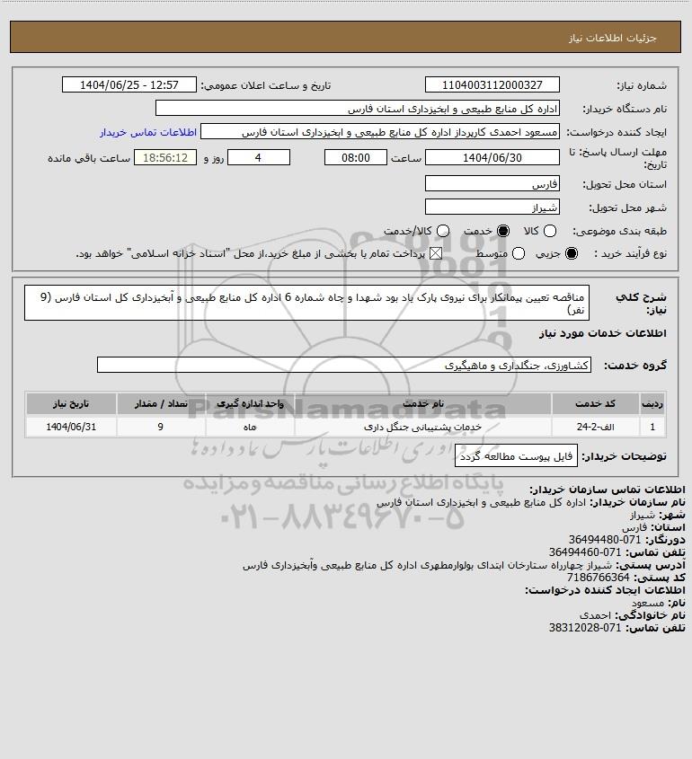 شرح کلی نیاز: مناقصه تعیین پیمانکار برای نیروی پارک یاد بود شهدا و چاه شماره 6 اداره کل منابع طبیعی و آبخیزداری کل استان فارس (9 نفر)
