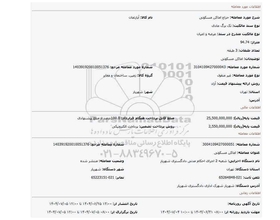 | شرح مورد معامله: حراج اماکن مسکونی | نام کالا: آپارتمان | |