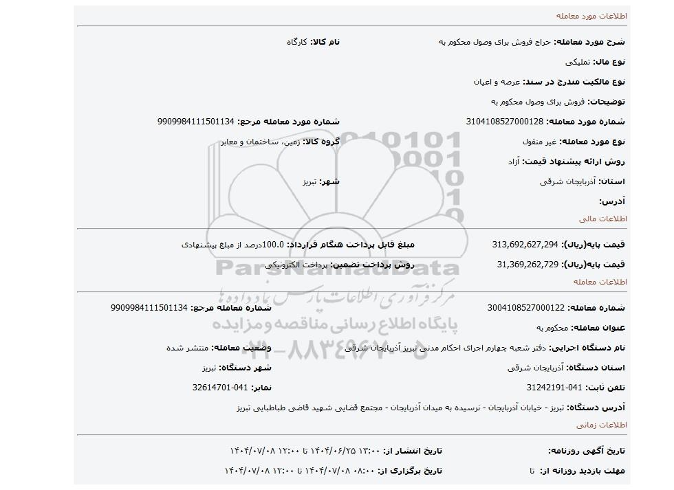 | شماره مورد معامله: 3104108527000128 | شماره مورد معامله مرجع: 9909984111501134 | |