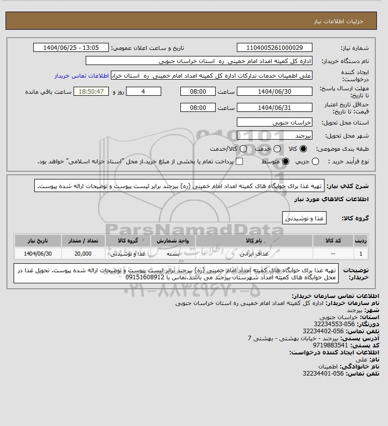 توضیحات خریدار:تهیه غذا برای خوابگاه های کمیته امداد امام خمینی (ره) بیرجند برابر لیست پیوست و توضیحات ارائه شده پیوست. تحویل غذا در محل خوابگاه های کمیته امداد شهرستان بیرجند می باشد.تماس با 09151608912