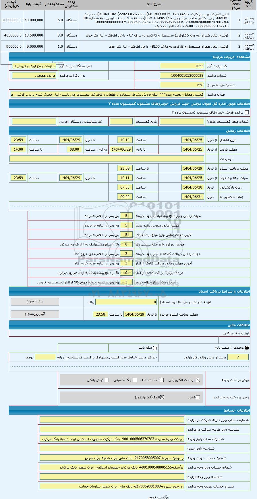 مزایده عمومی مزایده گوشی موبایل- توضیح مهم*** اینکه فروش بشرط استفاده از قطعات و فاقد کد ریجستری می باشد (انبار خوی) برگزار میگردد. از کلیه افراد متخصص و شرکت‌های واجد شرایط دعوت به عمل می‌آید تا در این مزایده با کد خبرگزاری پارس نماد : 9557028 شرکت نمایند تاریخ شروع مزایده : 1404/06/25 مهلت شرکت در مزایده: تا پایان روز 1404/06/29 مکان برگزاری اموال واگذاری استان‌های آذربایجان غربی و دسته‌بندی‌های مربوط به این حراجی مخابرات میباشد.