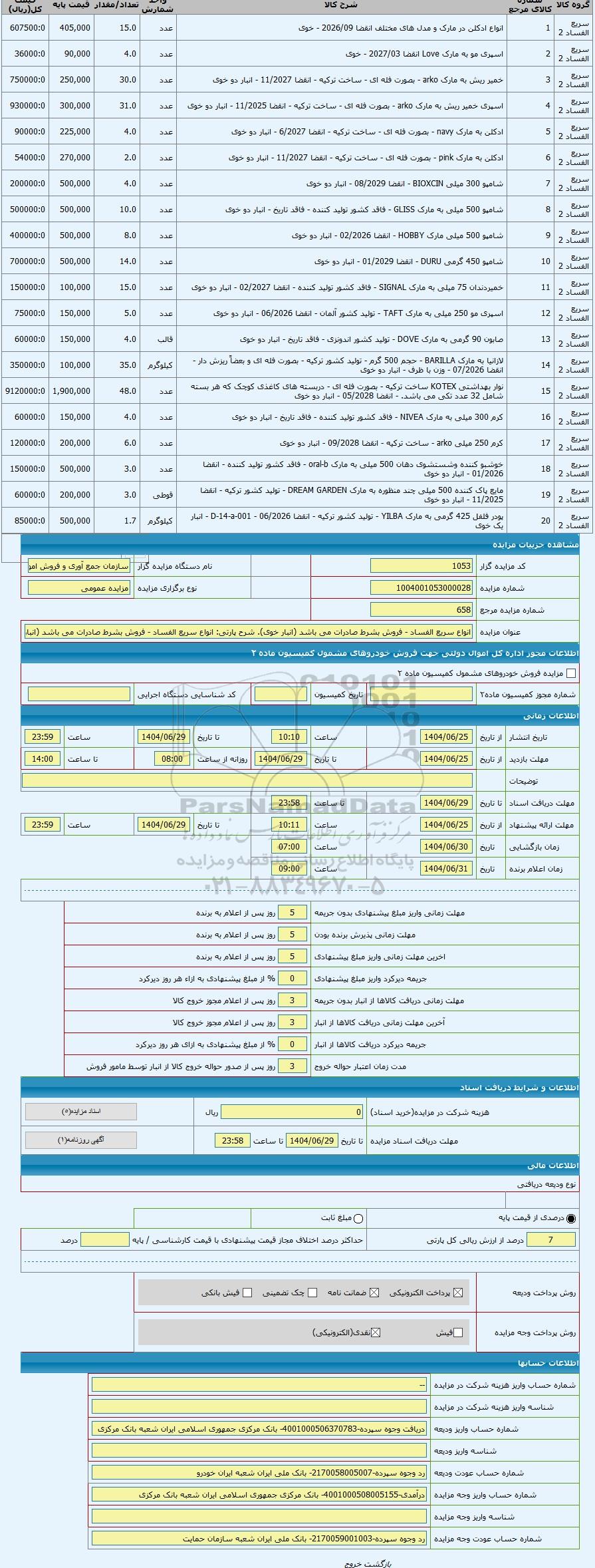 مزایده عمومی مزایده انواع سریع الفساد - فروش بشرط صادرات می باشد (انبار خوی) برگزار میگردد. از کلیه افراد متخصص و شرکتهای واجد شرایط دعوت به عمل میآید تا در این مزایده با کد خبرگزاری پارس نماد : 9557108 شرکت نمایند تاریخ شروع مزایده : 1404/06/25 مهلت شرکت در مزایده: تا پایان روز 1404/06/29 مکان برگزاری اموال واگذاری استانهای آذربایجان غربی و دستهبندیهای مربوط به این حراجی مواد غذایی و خشکبار, متفرقه میباشد.