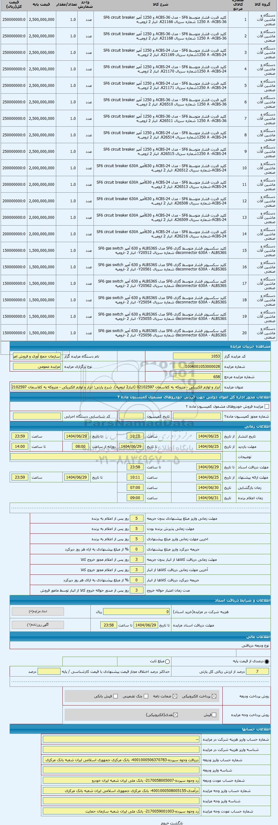 دستگاه و ماشین آلات صنعتی1کلید قدرت فشار متوسط SF6 - مدل ACBS-36 و 1250 آمپر SF6 circuit breaker 1250 A -ACBS-36 شماره سریال K21166، انبار 2 ارومیــه عدد1.02,500,000,000250000000:0