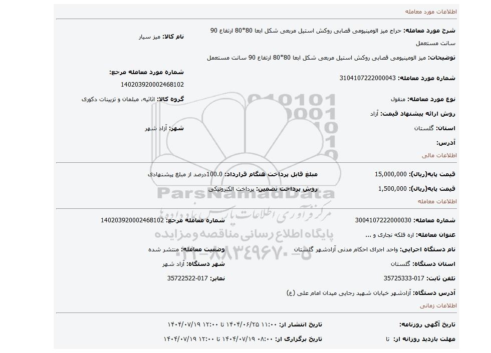 نام دستگاه اجرایی: واحد اجرای احکام مدنی آزادشهر گلستانوضعیت معامله: منتشر شده
