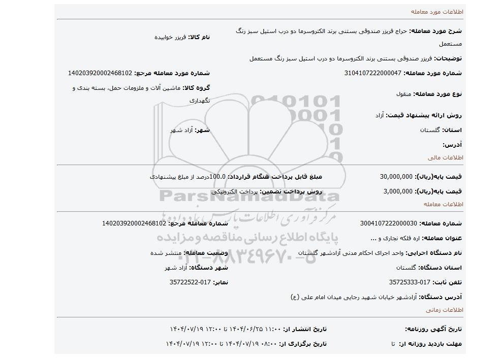 | نام دستگاه اجرایی: واحد اجرای احکام مدنی آزادشهر گلستان | وضعیت معامله: منتشر شده | |