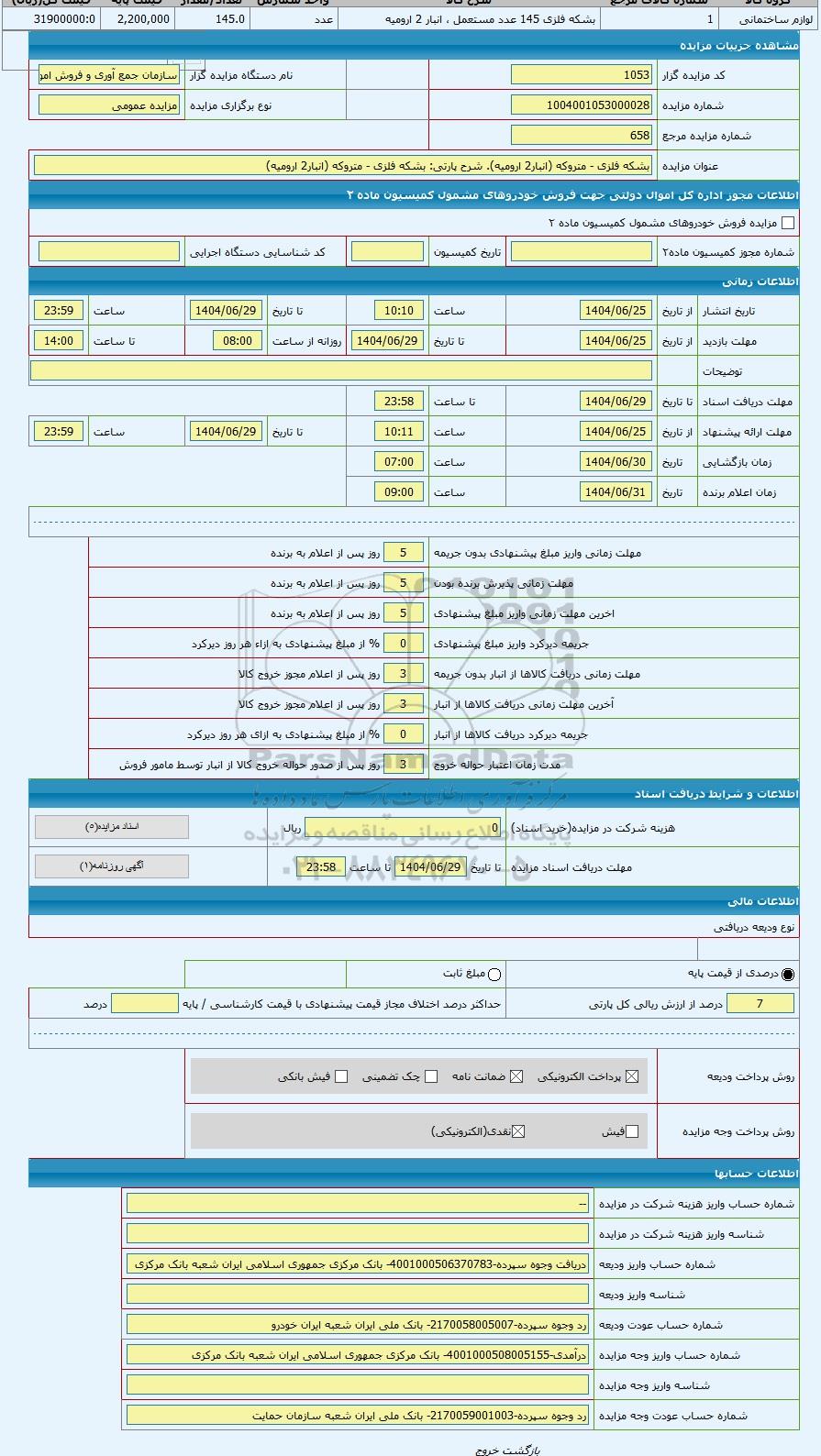 | شماره پارتی | 1104001053010895 | نوع برگزاری مزایده | مزایده عمومی | |