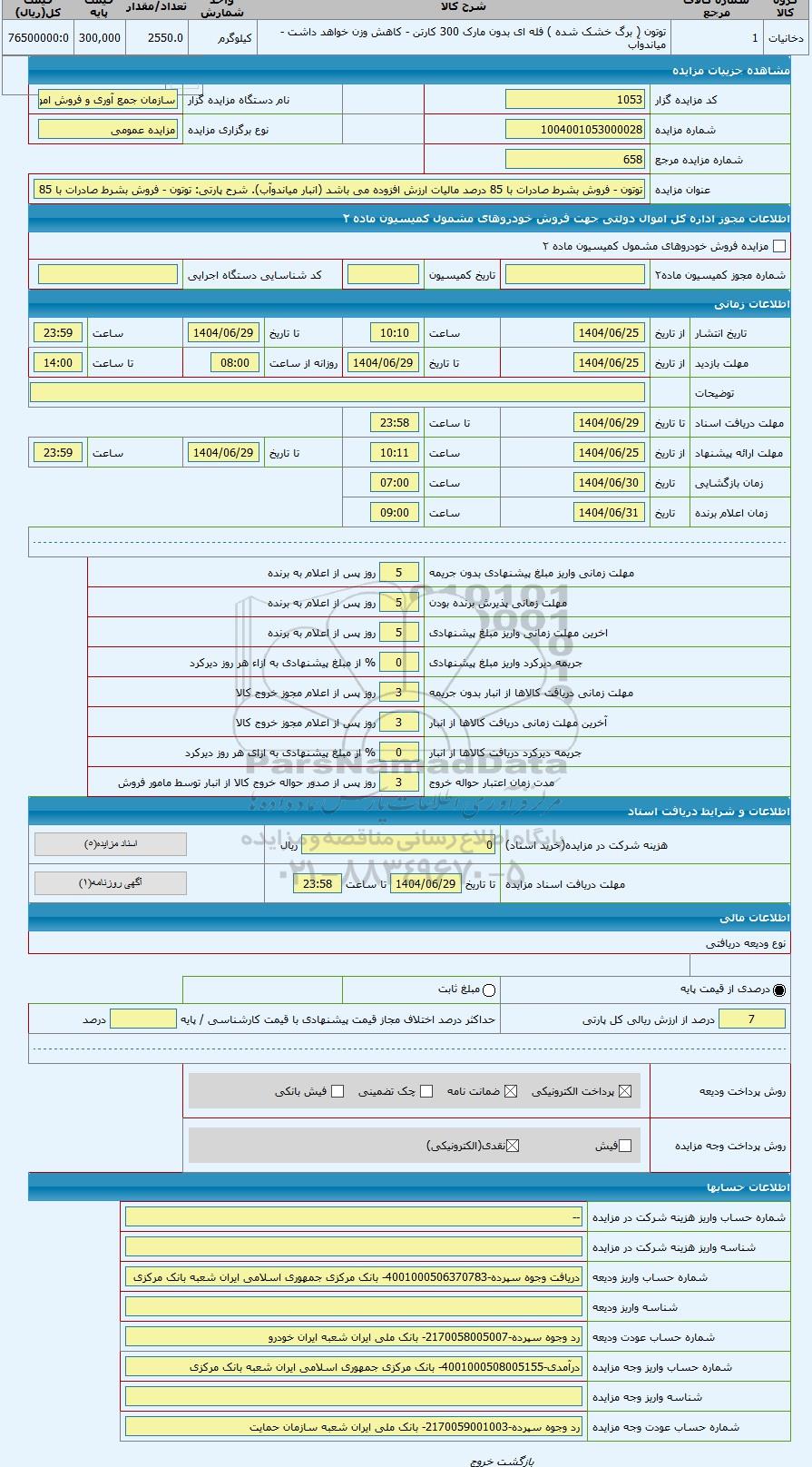 | عنوان مزایده | توتون - فروش بشرط صادرات با 85 درصد مالیات ارزش افزوده می باشد (انبار میاندوآب) | |||