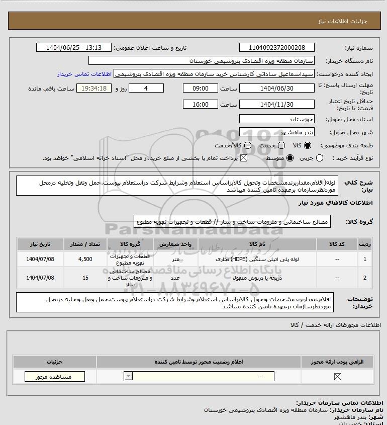 شرح کلی نیاز: لوله(اقلام،مقداربرندمشخصات وتحویل کالابراساس استعلام وشرایط شرکت دراستعلام پیوست.حمل ونقل وتخلیه درمحل موردنظرسازمان برعهده تامین کننده میباشد