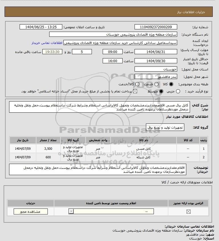 8 استعلام کابل ها ورساناها 9812126 1404/08/17 new special not payed خوزستان