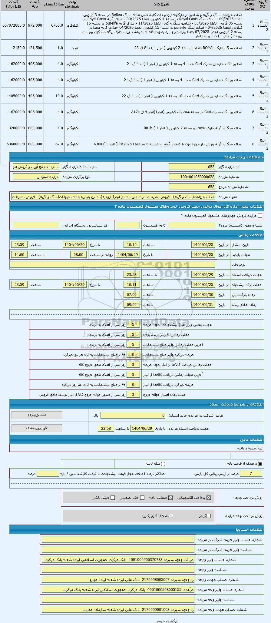 | عنوان مزایده | غذای حیوانات(سگ و گربه) - فروش بشرط صادرات می باشد( انبار1 ارومیه) | |||