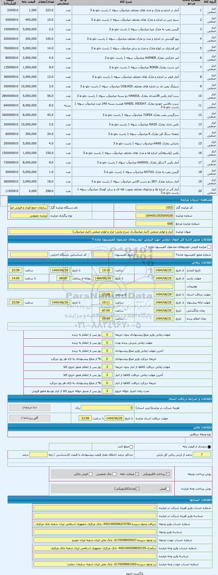 | عنوان مزایده | ابزار و لوازم صنعتی (انبار میاندوآب) | |||