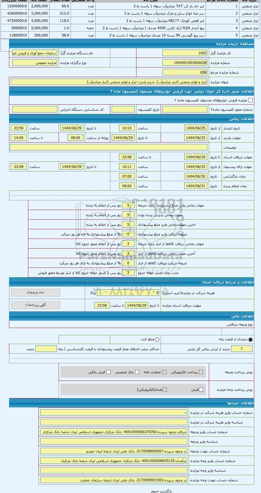 | عنوان مزایده | ابزار و لوازم صنعتی (انبار میاندوآب) | |||
