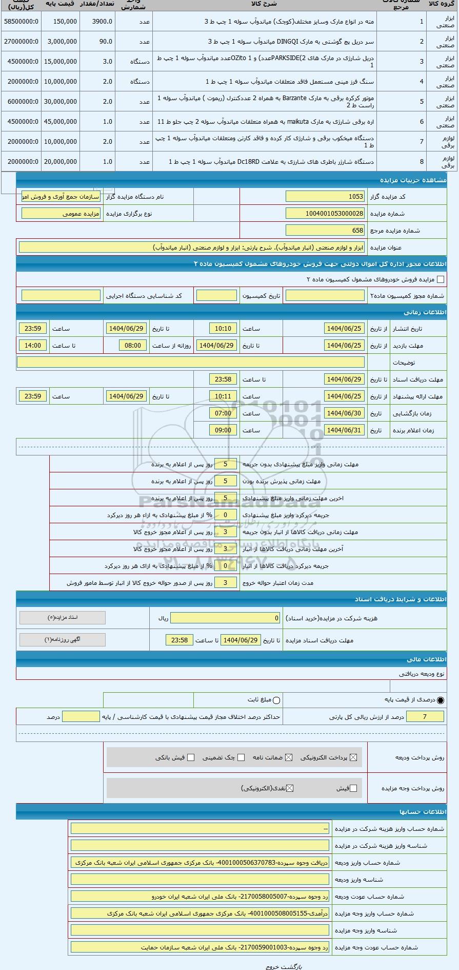 مزایده ابزار و لوازم صنعتی (انبار میاندوآب), مزایده ، ابزار و لوازم صنعتی (انبار میاندوآب)