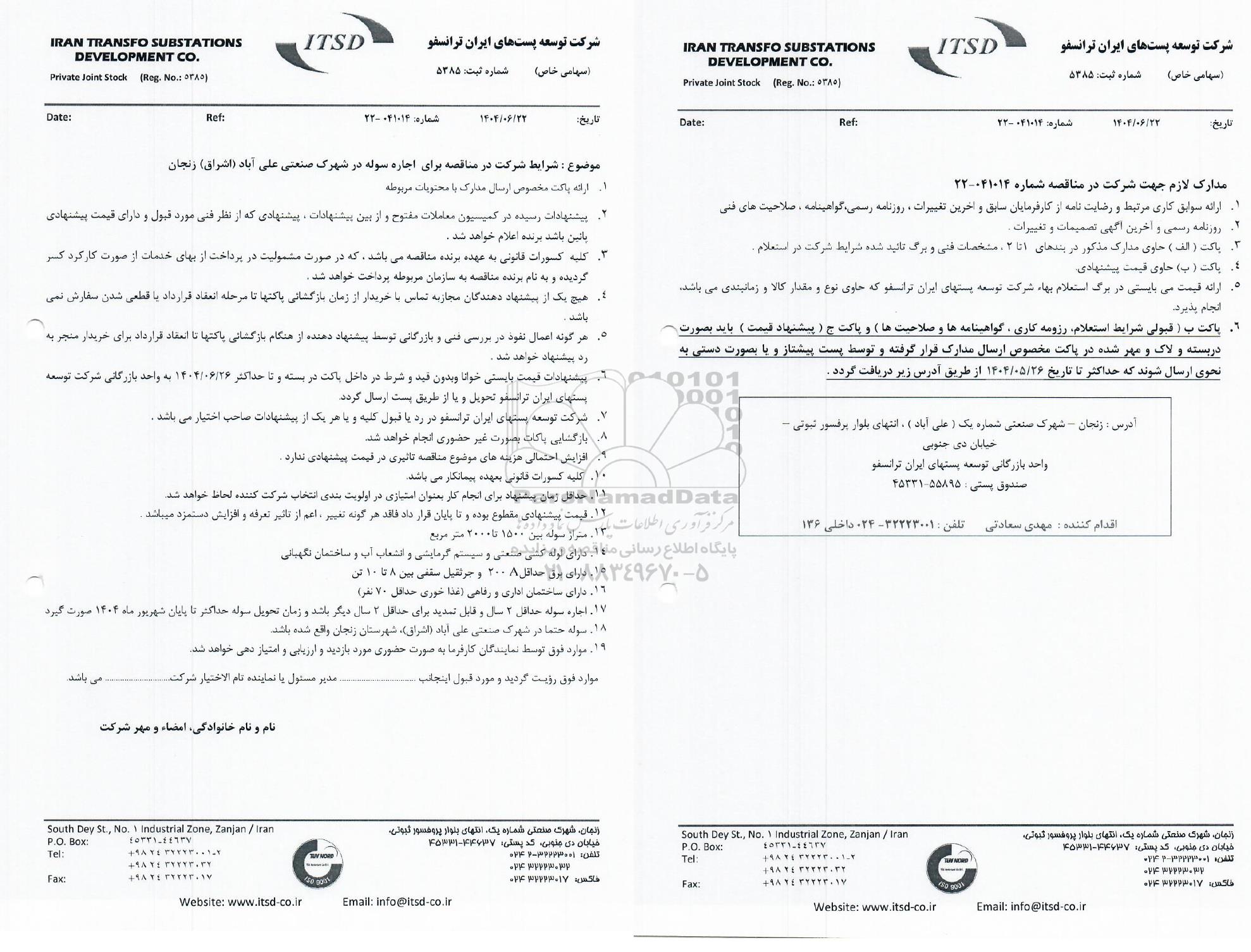 مدارک لازم جهت شرکت در مناقصه شماره 041014 - 22