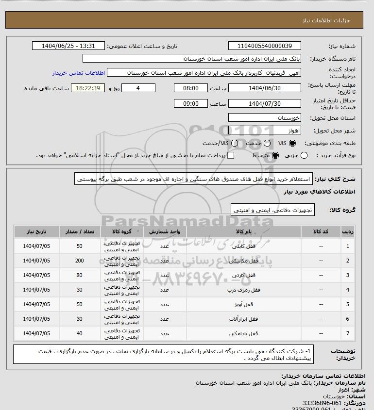 | 5 | -- | قفل آویز | عدد | تجهیزات دفاعی، ایمنی و امنیتی | 50 | 1404/07/05 |