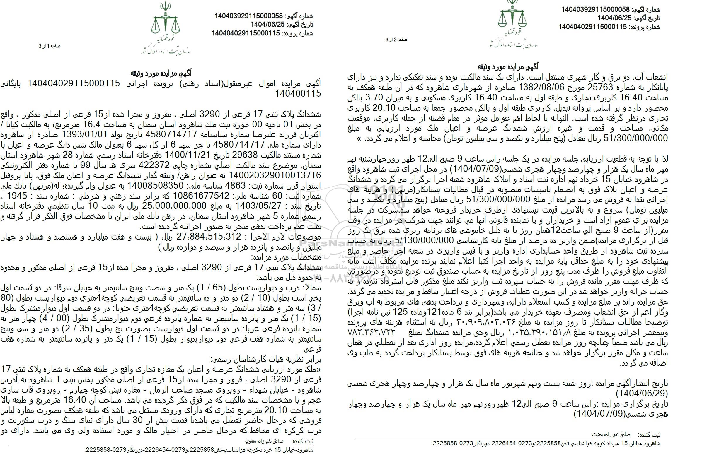 مزایده فروش ملک به پلاک ثبتی 17 فرعی از 3290 اصلی به مساحت 16.4 مترمربع