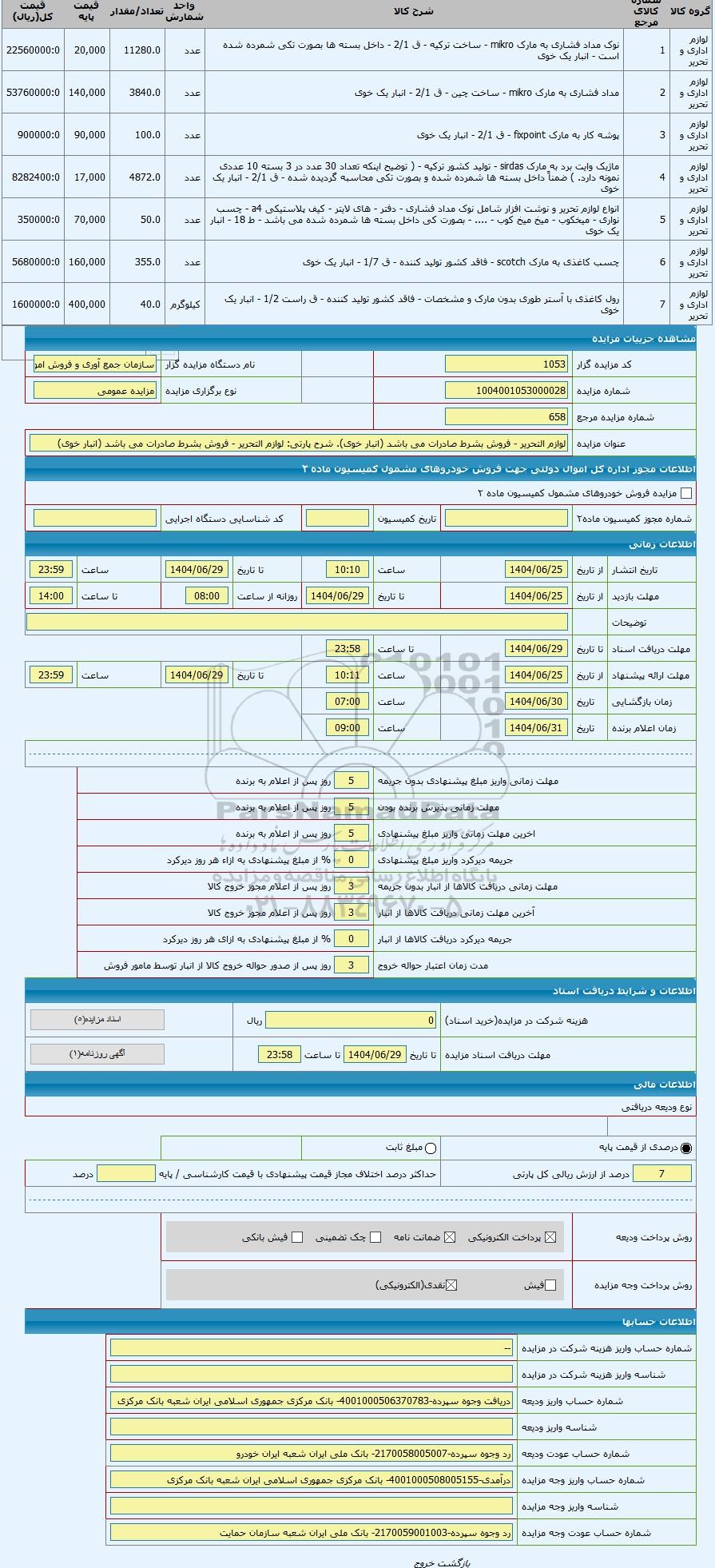 | عنوان مزایده | لوازم التحریر - فروش بشرط صادرات می باشد (انبار خوی) | |||
