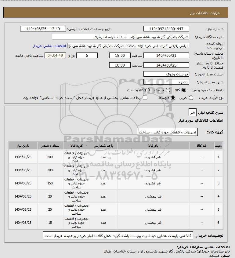 | 1 | -- | فنر فشرده | عدد | تجهیزات و قطعات حوزه تولید و ساخت | 200 | 1404/08/25 |