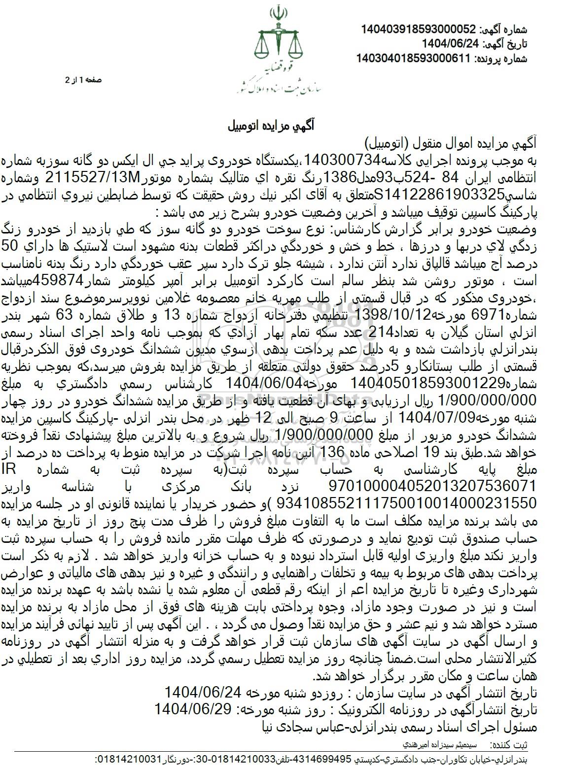 مزایده یک دستگاه خودرو پراید جی ال ایکس