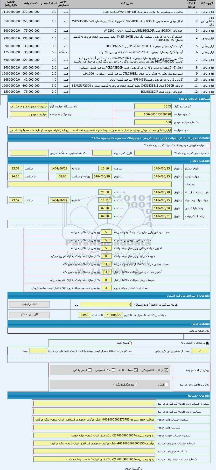 مزایده ، لوازم خانگی مختلف بوش موجود در انبار اختصاصی سازمان در منطقه ویژه اقتصادی سیرجان ( دارای هزینه نگهداری منطقه وکارشناسی