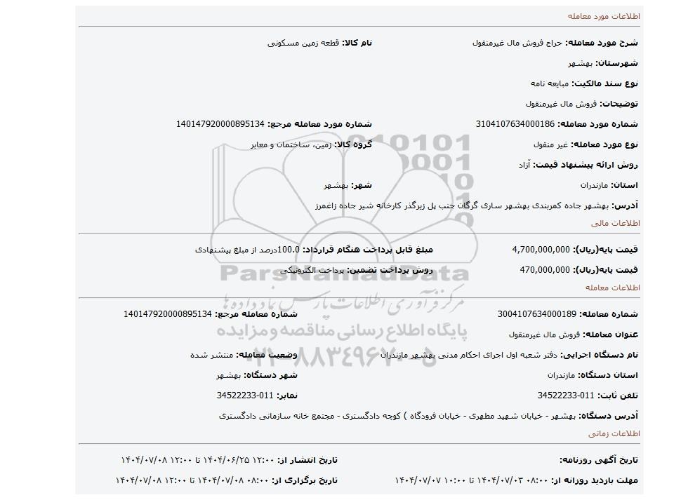 | شرح مورد معامله: حراج فروش مال غیرمنقول | نام کالا: قطعه زمین مسکونی | |
