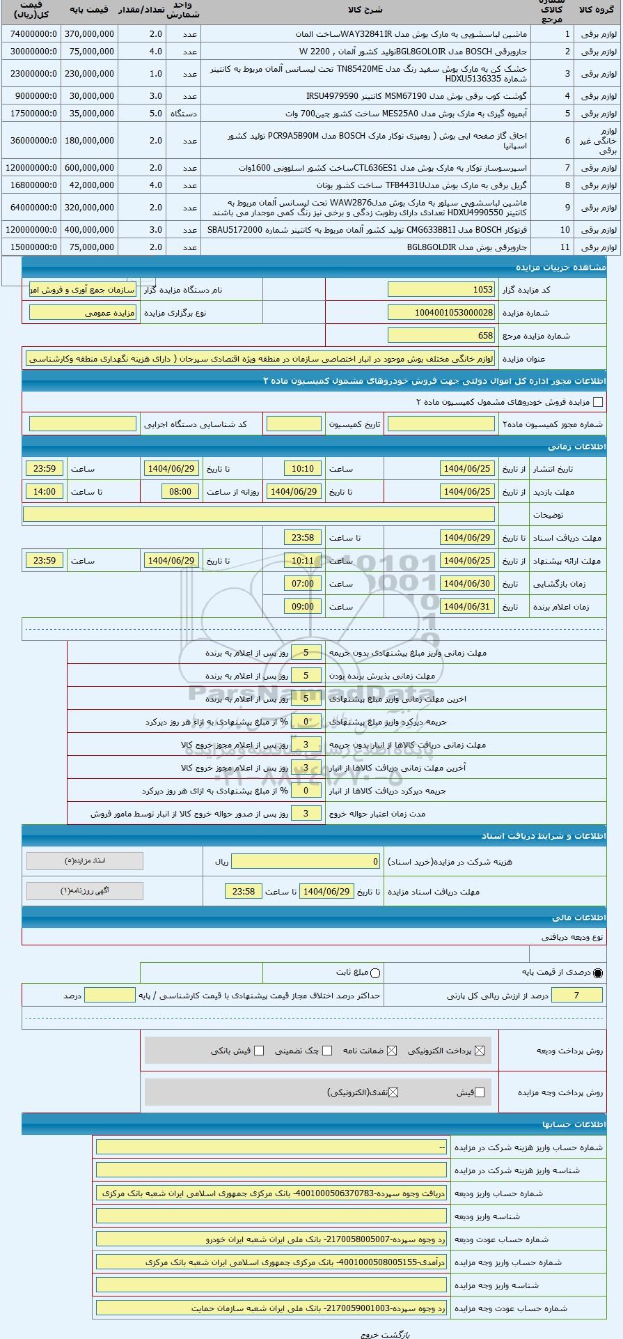مزایده ، لوازم خانگی مختلف بوش موجود در انبار اختصاصی سازمان در منطقه ویژه اقتصادی سیرجان ( دارای هزینه نگهداری منطقه وکارشناسی