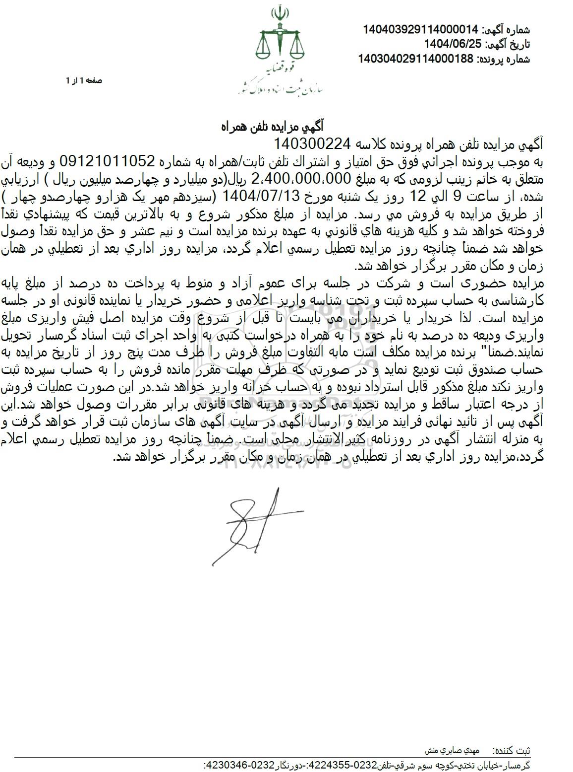 مزایده حق امتیاز و اشتراک تلفن همراه به شماره 09121011052