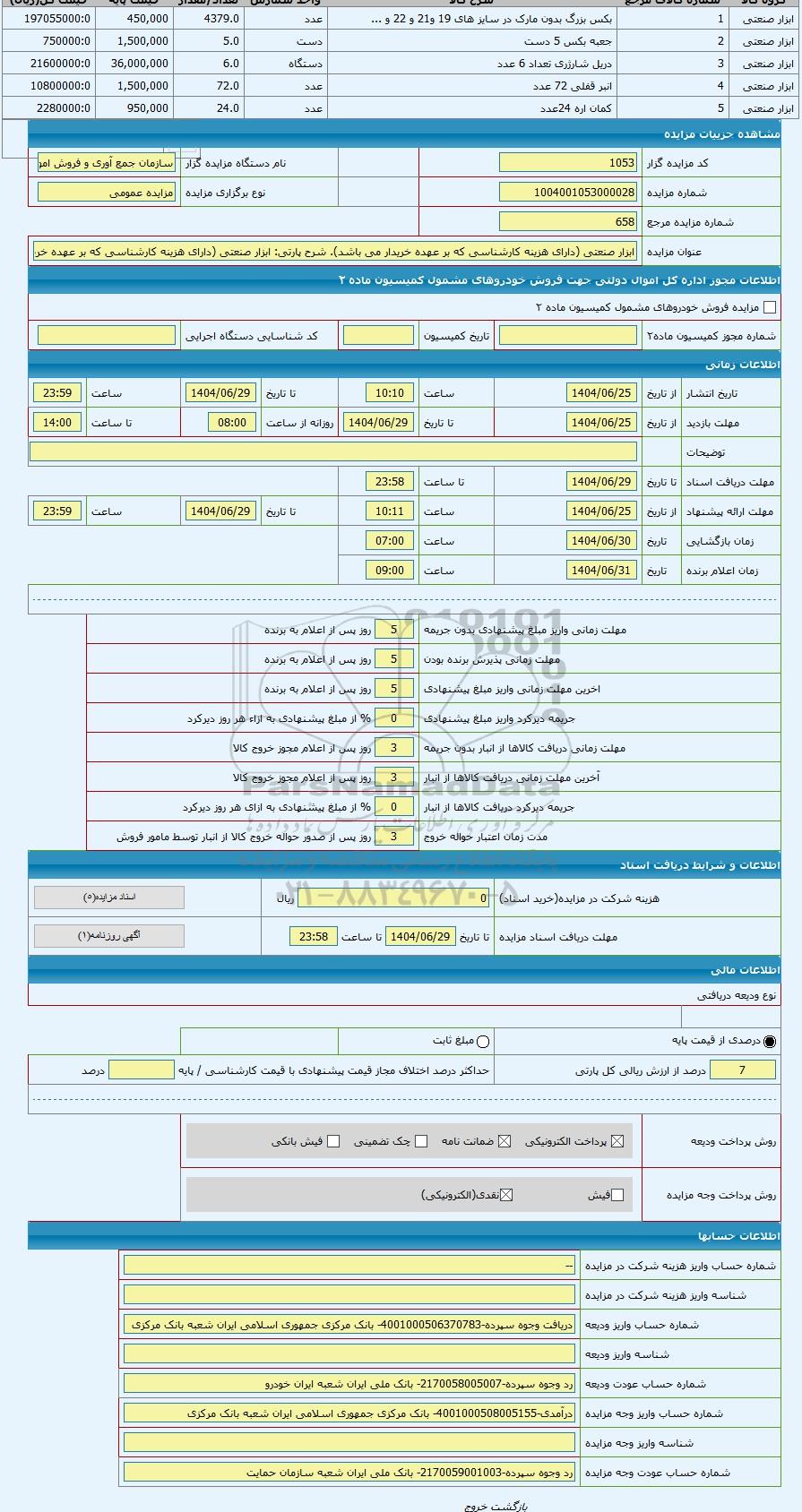 | کد مزایده گزار | 1053 | نام دستگاه مزایده گزار | سازمان جمع آوری و فروش اموال تملیکی | |