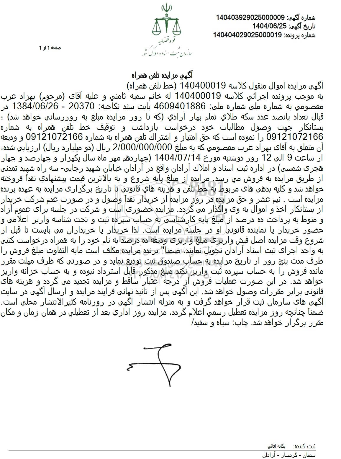 تمام آگهی ها طبق نمونه تصویر آگهی صرفا جهت اطلاع رسانی می باشد در خصوص استفاده از این آگهی هر گونه مسئولیت پرداخت به آگهی دهنده و بررسی و احراز هویت به عهده شرکت کنندگان می باشد و پایگاه خبری پارس نماد هیچگونه منفعت و مسئولیتی بابت تعهد این آگهی ندارد.