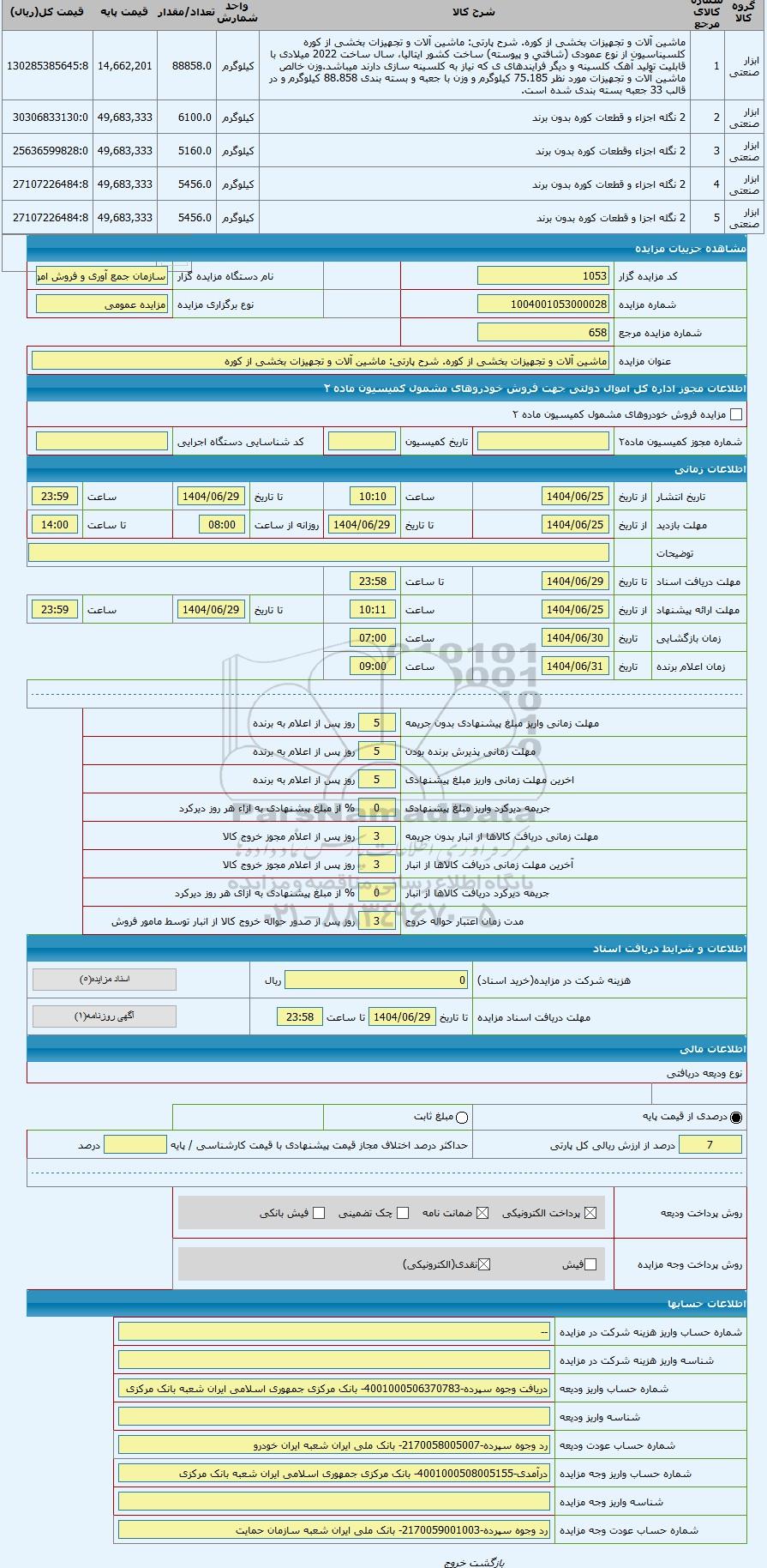 | کد مزایده گزار | 1053 | نام دستگاه مزایده گزار | سازمان جمع آوری و فروش اموال تملیکی | |
