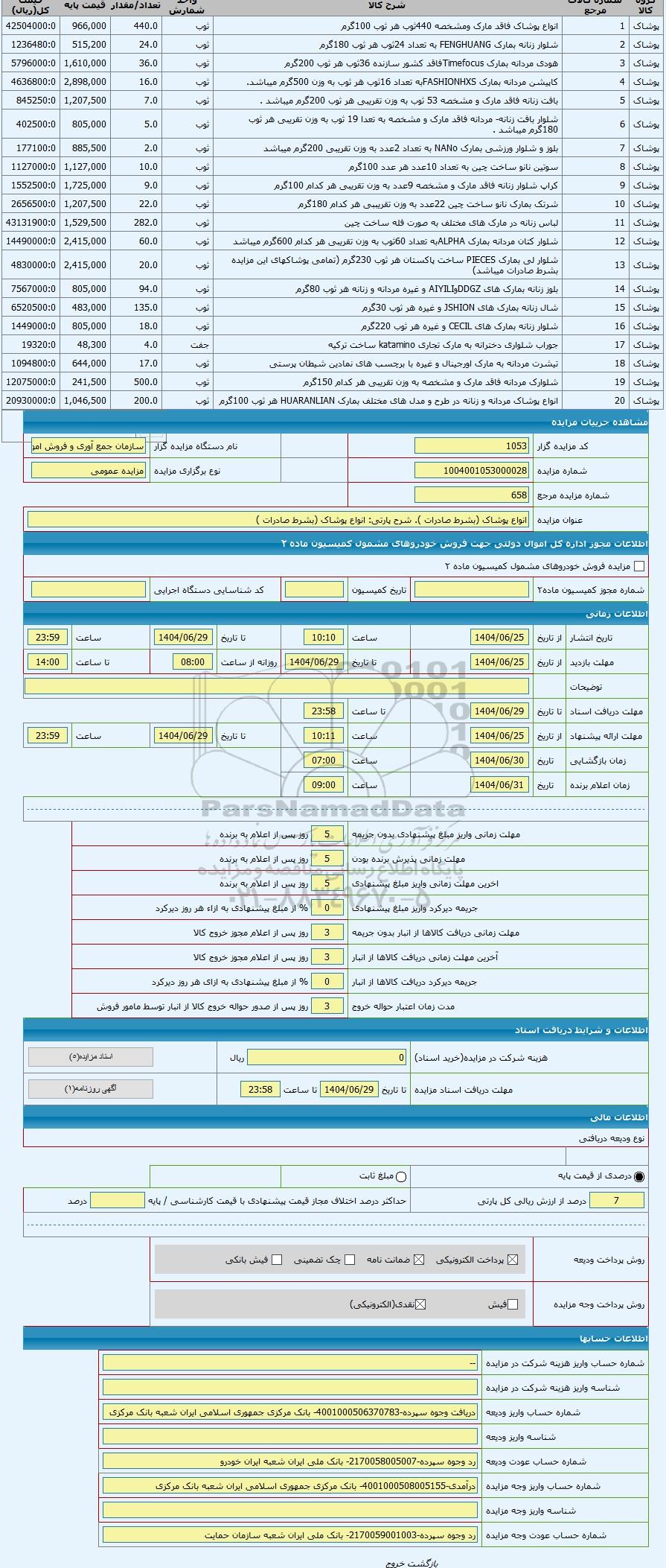 مزایده انواع پوشاک (بشرط صادرات ), مزایده ، انواع پوشاک (بشرط صادرات )