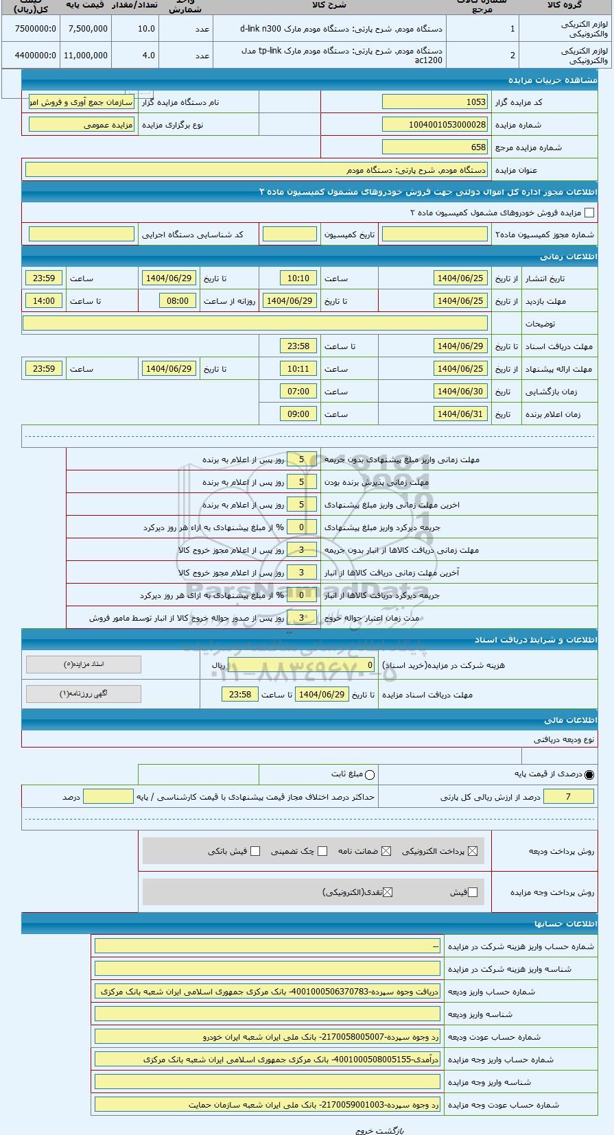 | لوازم الکتریکی والکترونیکی | 2 | دستگاه مودم مارک tp-link مدل ac1200 | عدد | 4.0 | 11,000,000 | 4400000:0 |
