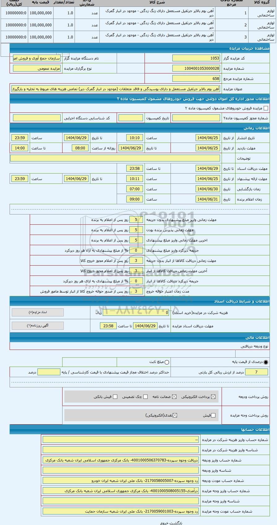 کد مزایده گزار1053نام دستگاه مزایده گزارسازمان جمع آوری و فروش اموال تملیکی